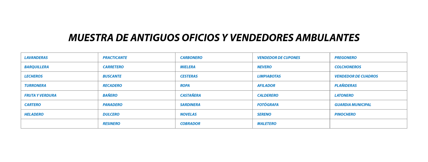 En definitiva, todos ellos nos hablan de tiempos difíciles, tiempos de grandes necesidades donde el hombre, sin embargo, vivía en equilibrio con la naturaleza y aprovechaba plenamente sus recursos. Con ello, hemos querido rendir homenaje: primero, a todos los oficios y vendedores ambulantes, importantes en su tiempo, que ya son recuerdo y que fueron desalojados por la modernidad; y no más importante, a los hombres y mujeres, artesanos y vendedores que siendo pioneros en el oficio, merecen el mejor de nuestro reconocimiento y admiración.