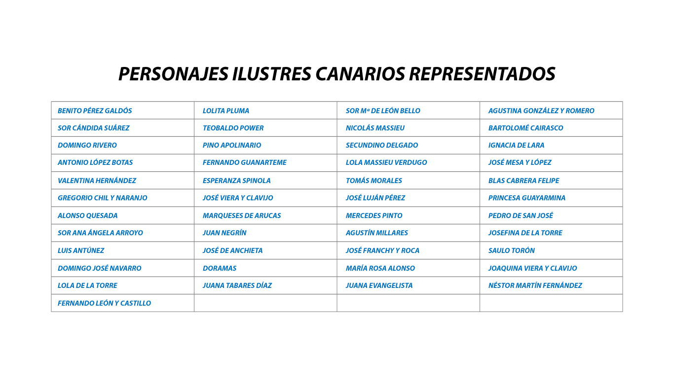 Benito Pérez Galdós, Teobaldo Power, Sor Cándida Suárez, Tomás Morales, Juana Evangelista, Doramas, Fernando León y Castillo, Mercedes Pinto, José Luján Pérez, Fernando Guanarteme, Juana Tabares, Josefina De la Torre Millares, José Franchy y Roca, el Padre Anchieta, y así hasta más de cincuenta personajes, nos harán disfrutar de una ocasión soñada.